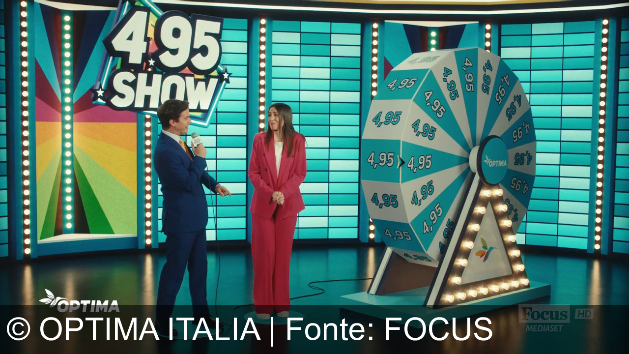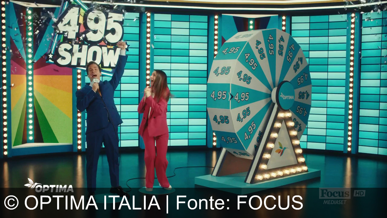 Una ruota azzurra e bianca gira al centro della scena, piena di spicchi con scritto 4,95. Luci intorno illuminano l’area e il set ha colori vivaci in stile gioco a premi. Al centro della ruota c’è il nome Optima.
