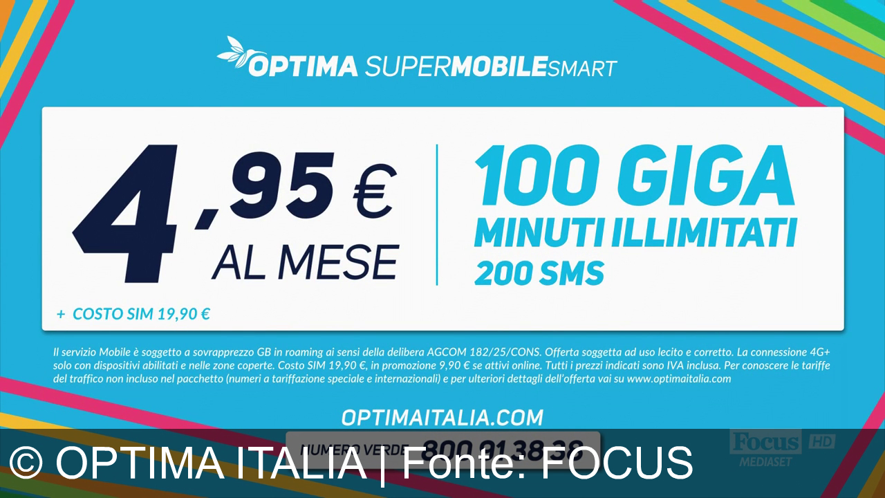 Optima promuove l’offerta mobile Super Mobile Smart: 100 GB, minuti illimitati e 200 SMS a 4,95 € al mese. Il messaggio, in stile gioco a premi, evidenzia il prezzo vantaggioso e ricorda che Optima offre anche luce, gas, internet e mobile in un’unica soluzione per semplificare la vita.