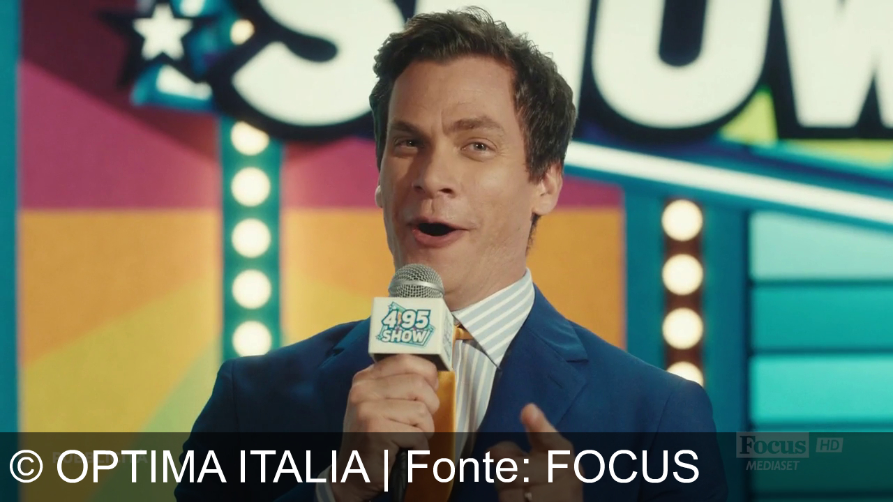 Un uomo in giacca blu tiene un microfono con il logo di uno show e sorride dritto in camera. Dietro di lui ci sono luci e pannelli colorati da studio televisivo. Usa un gesto con la mano mentre parla.