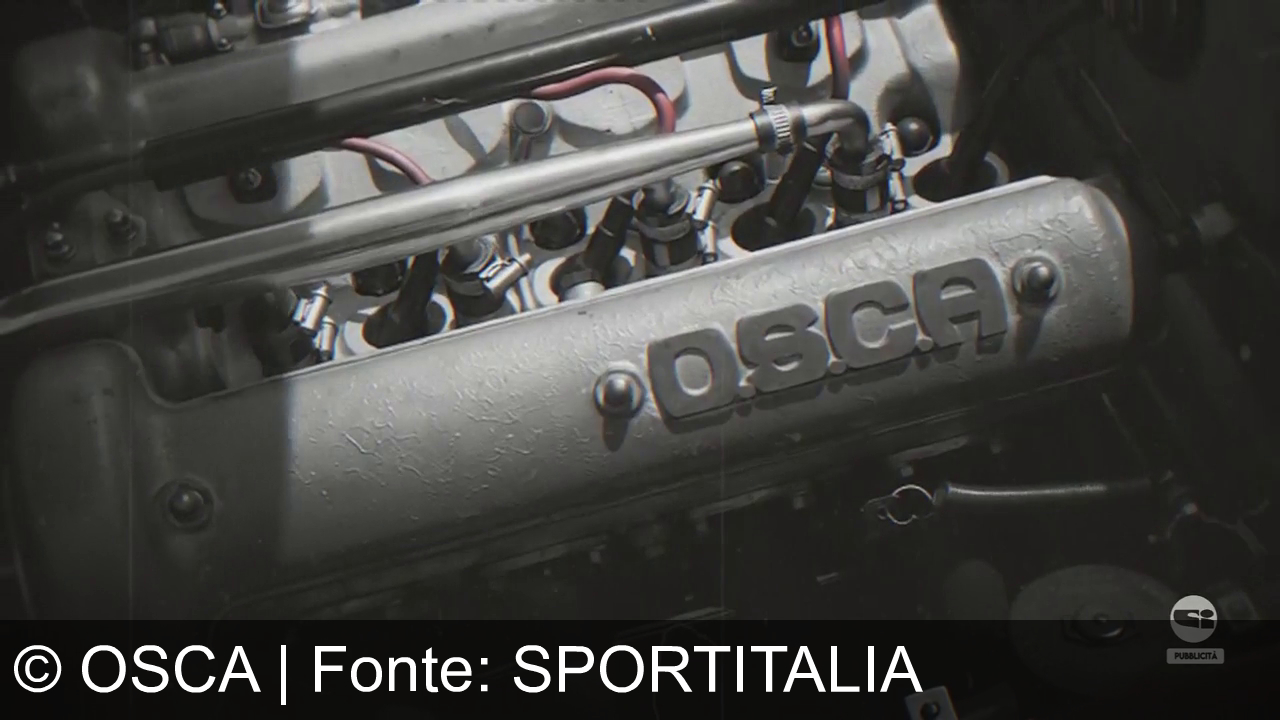 Particolare di un motore con la scritta "OSCA" su un coperchio metallico. Cavi elettrici e tubi visibili attorno. L'atmosfera è retrò e in bianco e nero. In basso a destra, un piccolo logo e la parola "PUBBLICITÀ".