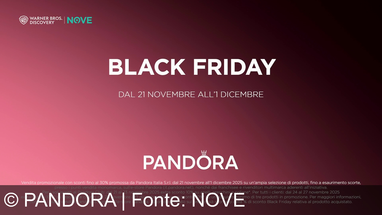 Pubblicità dell'anno 2025 di Pandora, con il titolo da noi scelto: "Pandora Black Friday: gioielli unici con sconti fino al 30% in negozio e online fino al 1 dicembre" con la breve descrizione: "Scopri il Black Friday Pandora su Warner Bros. Discovery e Nove: gioielli unici con sconti fino al 30%! Solo fino al 1 dicembre nei negozi e online. Non perdere questa occasione speciale!". Questo annuncio riguarda o include la categoria Gioielli, Regalo, Sconto, Orecchini, Collana, Orologi.