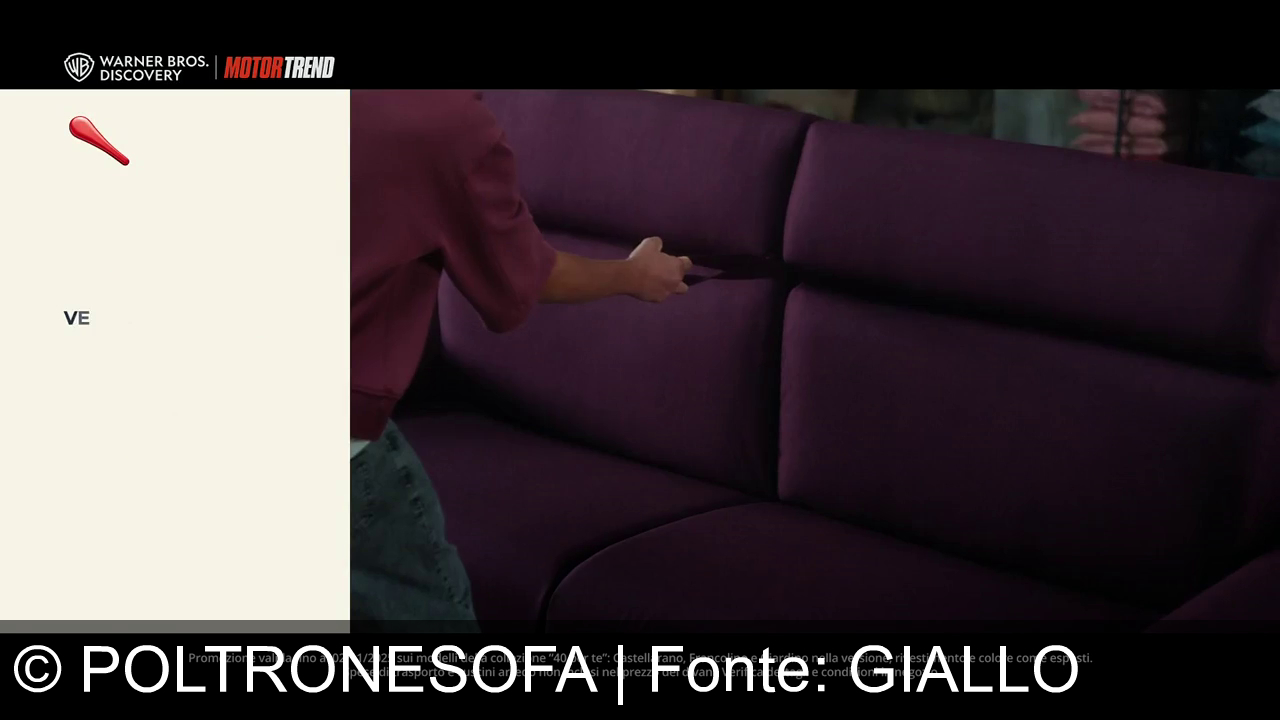 Una persona in piedi davanti a un divano viola, sta infilando qualcosa tra i cuscini. Maglietta bordeaux e jeans. A sinistra dello schermo, logo Warner Bros. Discovery e MotorTrend, con sfondo chiaro e icona a forma di goccia rossa sopra la scritta "VE". Scritte in basso parlano di una promozione valida fino al 2025.