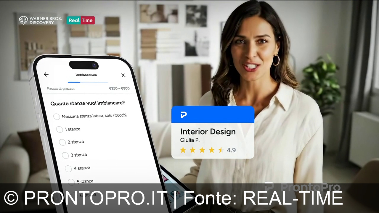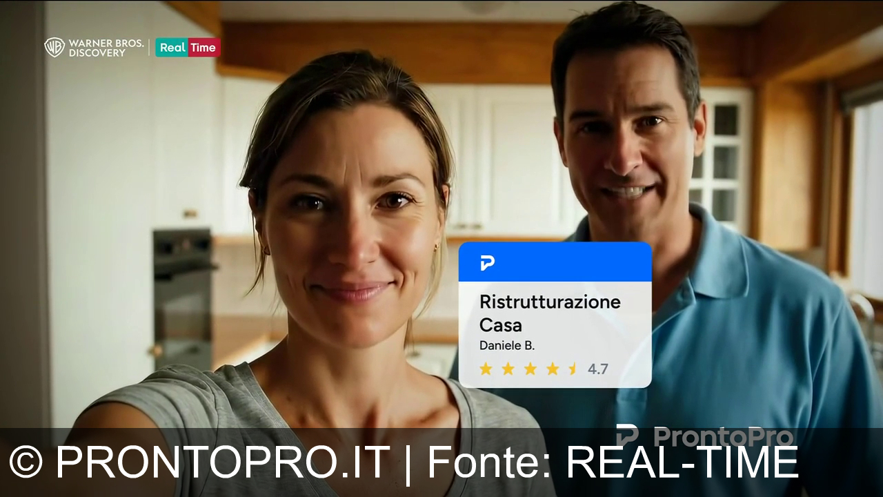 Due persone sorridenti in una cucina moderna. Sullo schermo c'è un riquadro con scritto "Ristrutturazione Casa" e una valutazione di 4,7 stelle associata a "Daniele B.". In alto a sinistra i loghi di Warner Bros. Discovery e Real Time, in basso a destra il logo di ProntoPro.