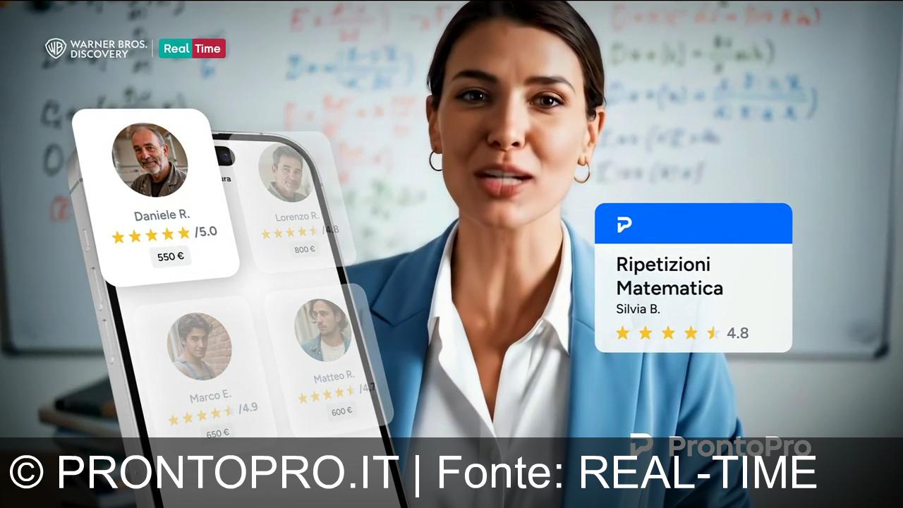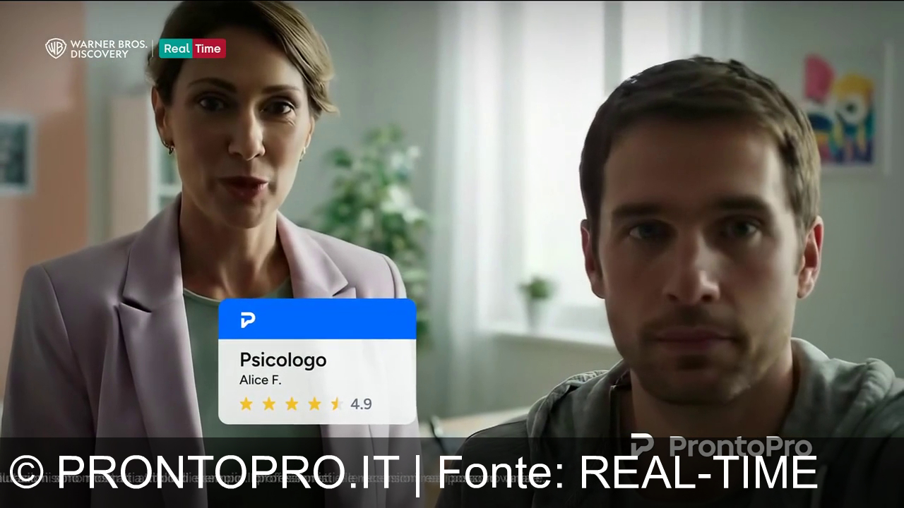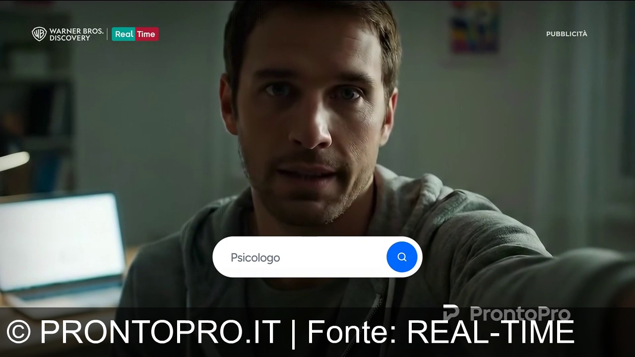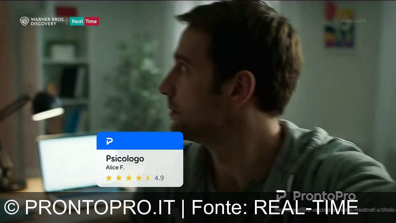 Un uomo con una felpa grigia guarda verso la telecamera. Sullo schermo c'è una barra di ricerca con la parola "Psicologo" e il logo di ProntoPro. In alto a sinistra ci sono i loghi di Warner Bros. Discovery e Real Time. A destra, la scritta "PUBBLICITÀ". Dietro l'uomo, sfocato, c'è un laptop aperto.