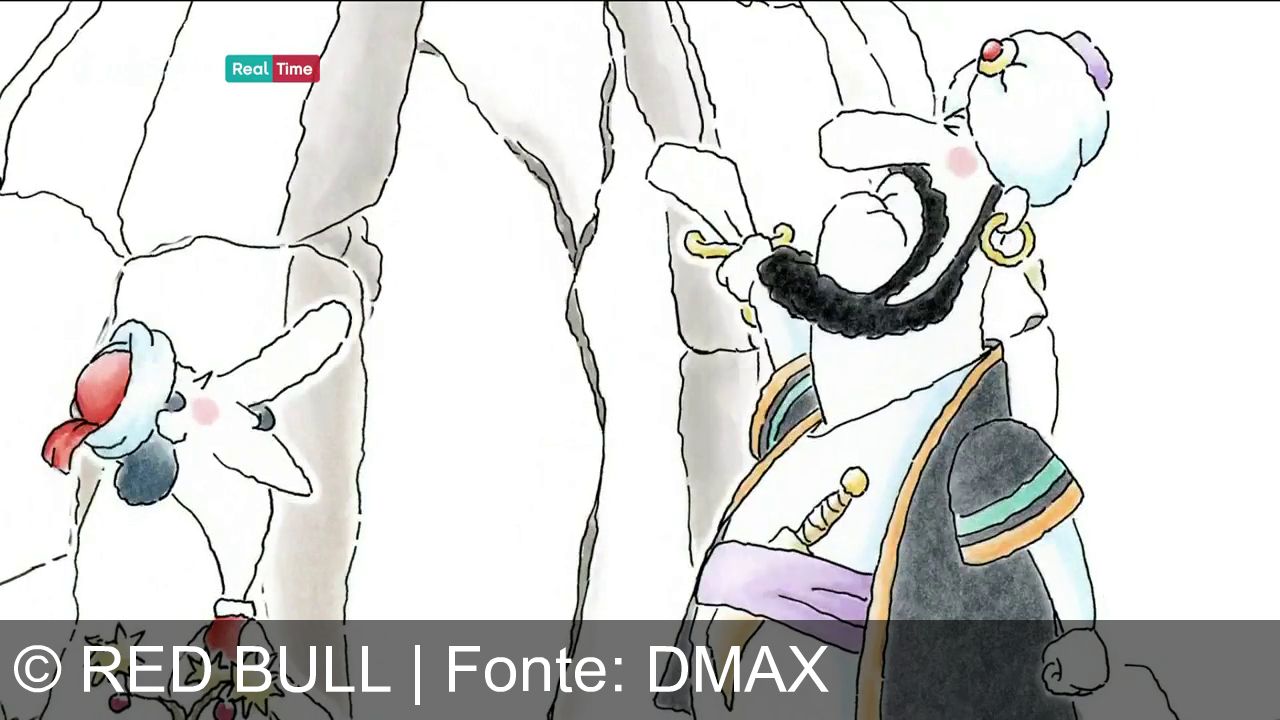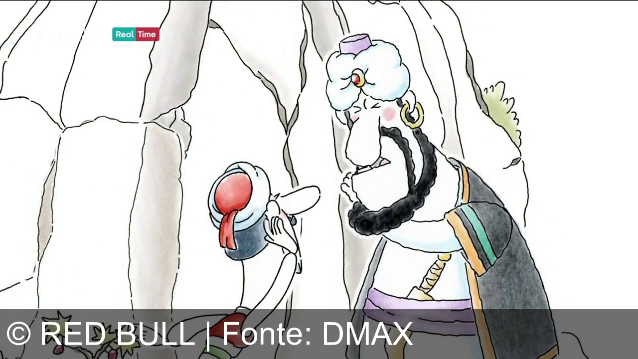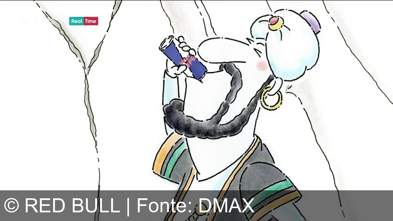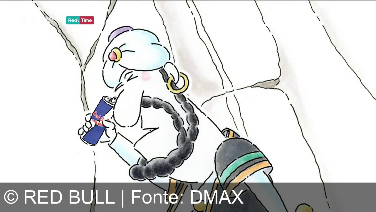 Un cartone animato raffigura un personaggio che sorride mentre tiene una lattina di Red Bull. Indossa un copricapo rosso e bianco e un top a righe. Il marchio "Red Bull" è visibile sulla lattina blu. Sullo sfondo ci sono linee che formano una grotta o una parete rocciosa. In alto a sinistra c'è il logo del canale "Real Time".