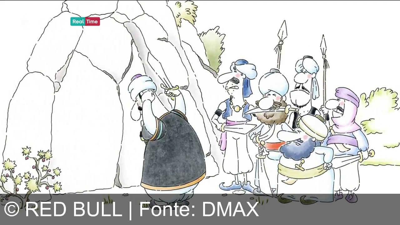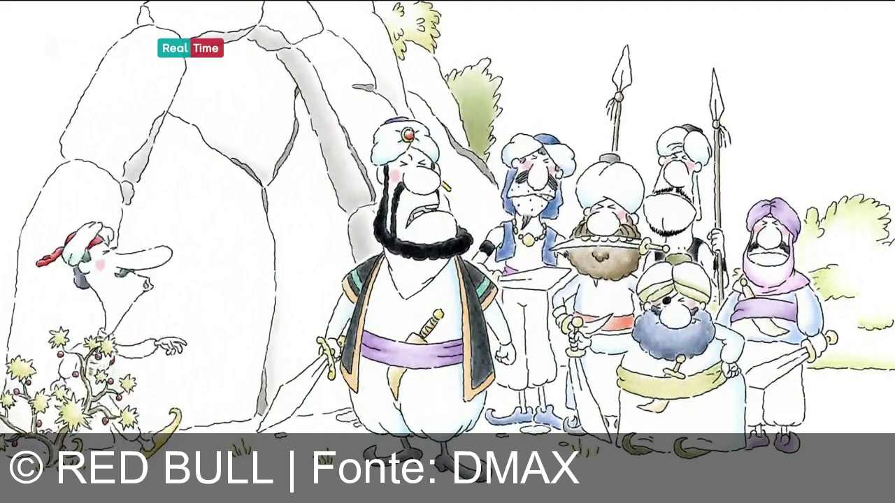 In sottofondo si vede un cartone animato. Un personaggio con un turbante e una barba nera sta guardando verso l'alto. Indossa vestiti colorati con ornamenti dorati. C'è anche un fiore a sinistra dell'immagine. Parte del logo del canale "Real Time" compare in alto.