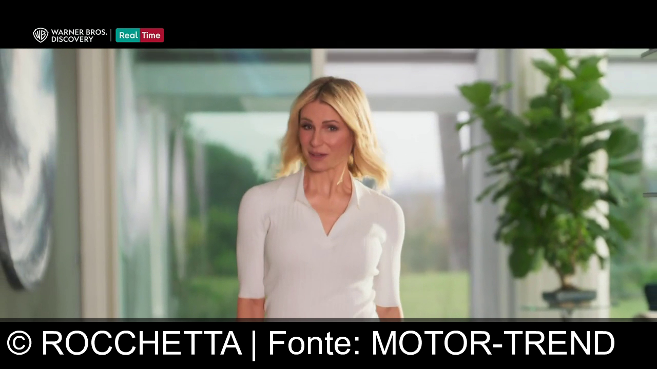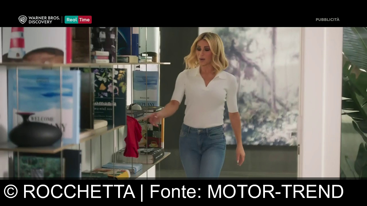 Una donna bionda con una maglietta bianca e jeans cammina vicino a uno scaffale con libri e oggetti. Sullo sfondo, un grande quadro con paesaggio naturale. In alto a sinistra, loghi di Warner Bros. Discovery e Real Time. In alto a destra, la scritta "PUBBLICITÀ".