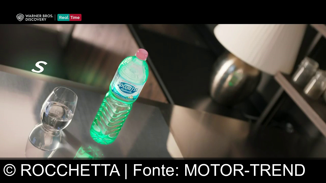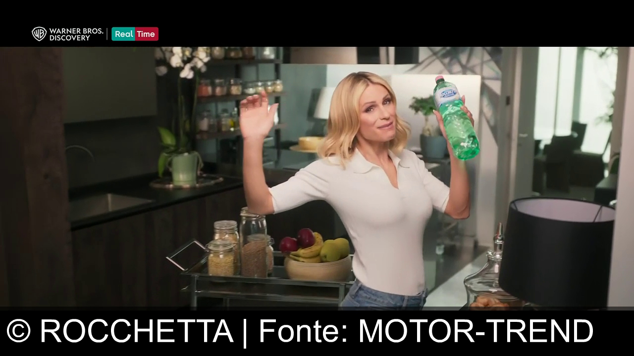 Due bottiglie d'acqua Rocchetta su un fondo sfocato, una grande e una piccola. Testo rosso in evidenza: "ACQUA della SALUTE PULITI dentro e BELLI fuori". Logo Warner Bros. Discovery e Real Time in alto a sinistra.