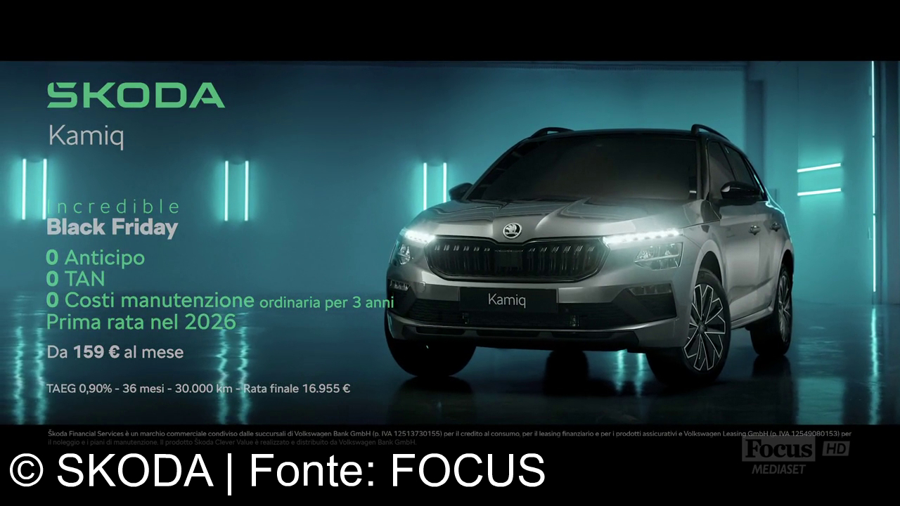 In uno sfondo blu con luci verticali, c'è un'auto Škoda Kamiq. Testo a sinistra indica offerte Black Friday: 0 anticipo, 0 TAN, 0 costi di manutenzione per 3 anni, prima rata nel 2026, da 159 € al mese. Dettagli di finanziamento in piccolo in basso. Marca Focus HD Mediaset visibile nell'angolo inferiore destro.