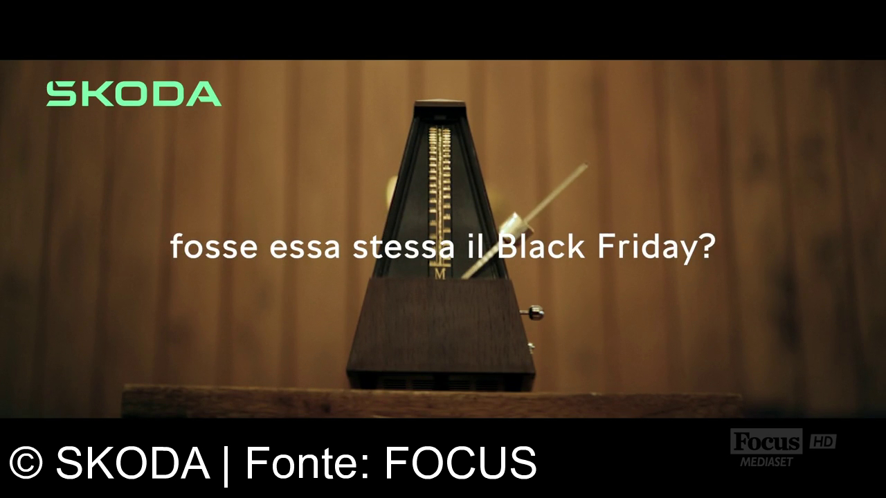 Un metronomo su un tavolo con sfondo di pannelli di legno. In alto a sinistra c'è il logo verde "SKODA". Al centro, una scritta bianca: "fosse essa stessa il Black Friday?". In basso a destra, "Focus" e "Mediaset" in bianco con sfondo nero.