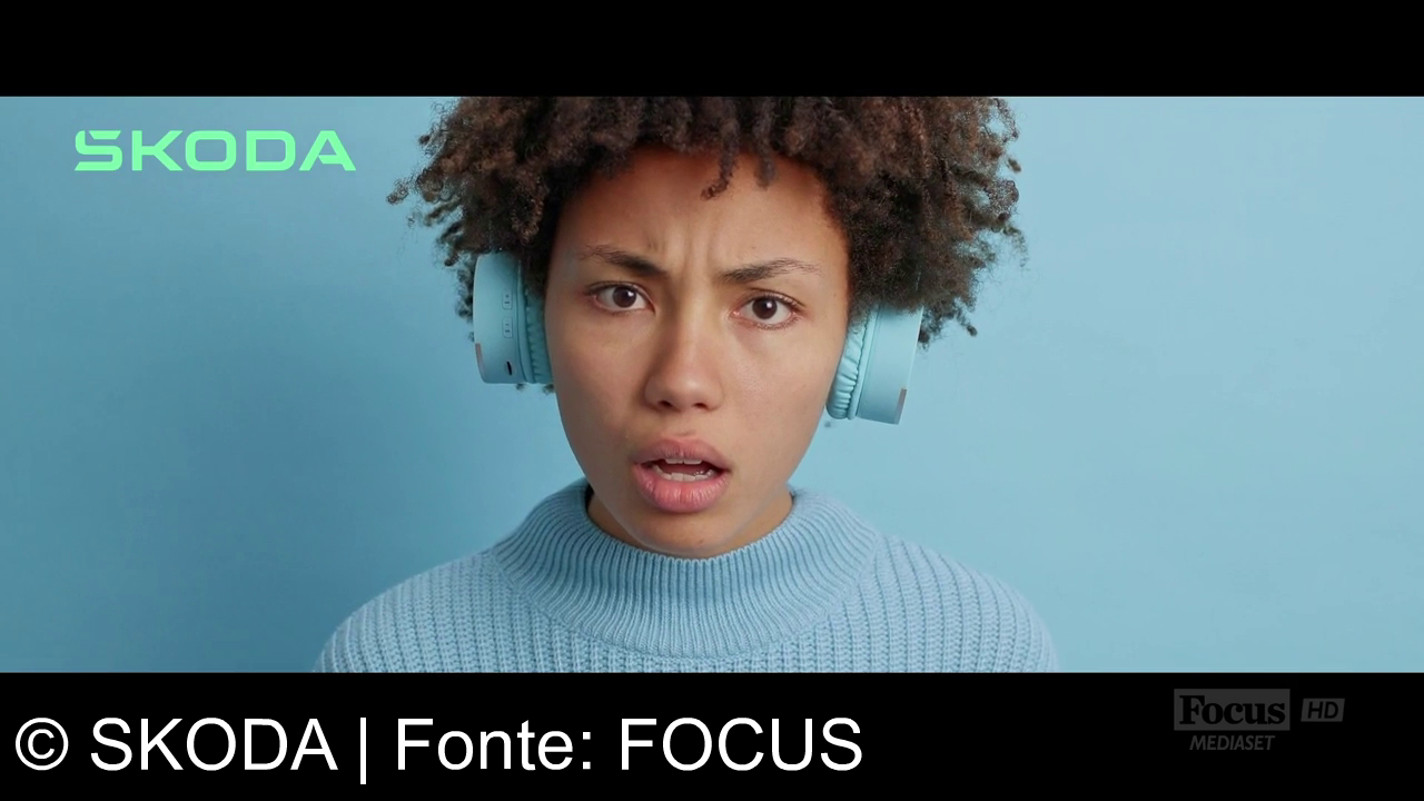 Una persona con cuffie azzurre guarda verso lo schermo con un'espressione sorpresa. Indossa un maglione dello stesso colore delle cuffie. Lo sfondo è azzurro, il logo "ŠKODA" si trova in alto a sinistra e il marchio "Focus HD Mediaset" si vede negli angoli inferiori.