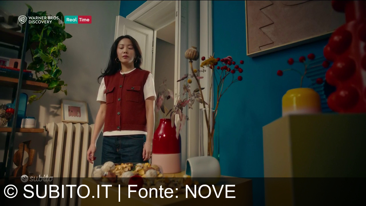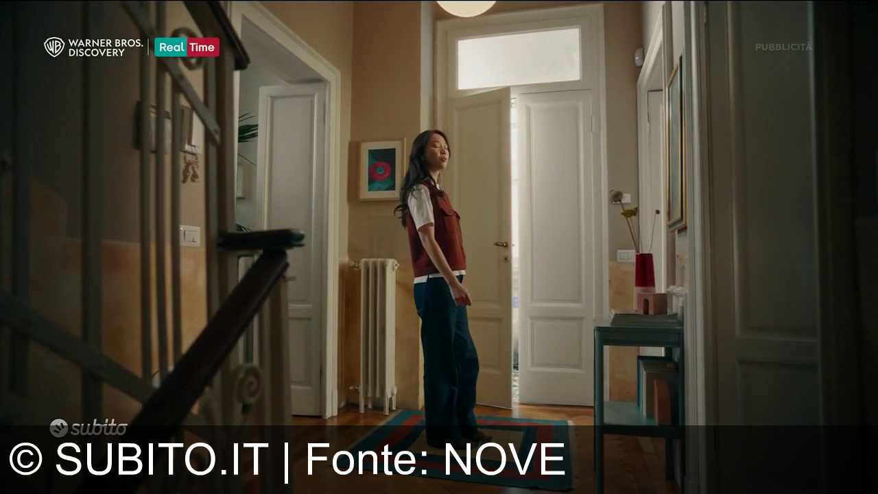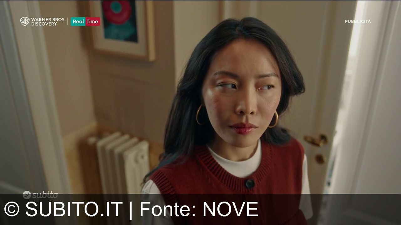 Una donna con lunghi capelli neri e orecchini a cerchio guarda di lato. Indossa un gilet rosso su una maglia bianca a maniche lunghe. Uno sfondo dal design semplice con radiatore, porta e un quadro appeso. Nell'angolo in alto a sinistra ci sono i loghi di Warner Bros. Discovery e Real Time; in basso a sinistra il logo 'subito'. A destra si legge "PUBBLICITÀ".