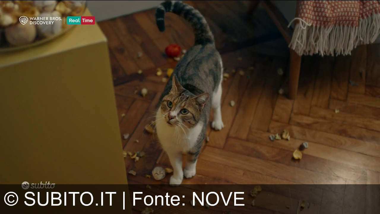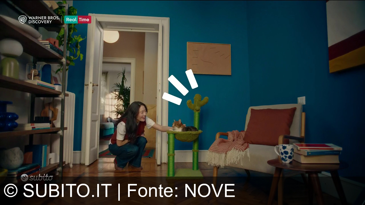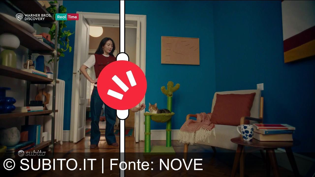 Una donna accovacciata accarezza un gatto su un tiragraffi verde a forma di cactus. La stanza ha pareti blu, un divano beige con un cuscino marrone e una coperta arancione, un tavolino con una tazza blu a pois e libri. Sulla sinistra, c'è una libreria con oggetti decorativi. La porta sullo sfondo è aperta. Sullo schermo, il logo "Subito" e quello di "Warner Bros. Discovery" con la scritta "Real Time".