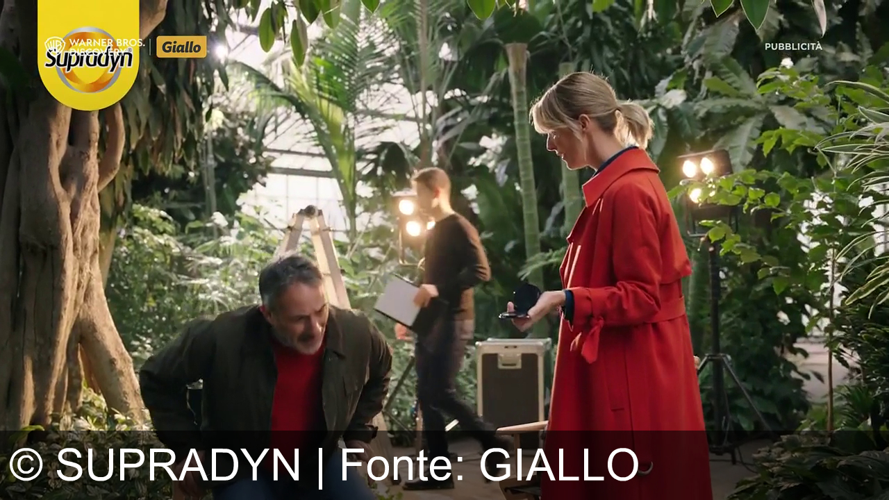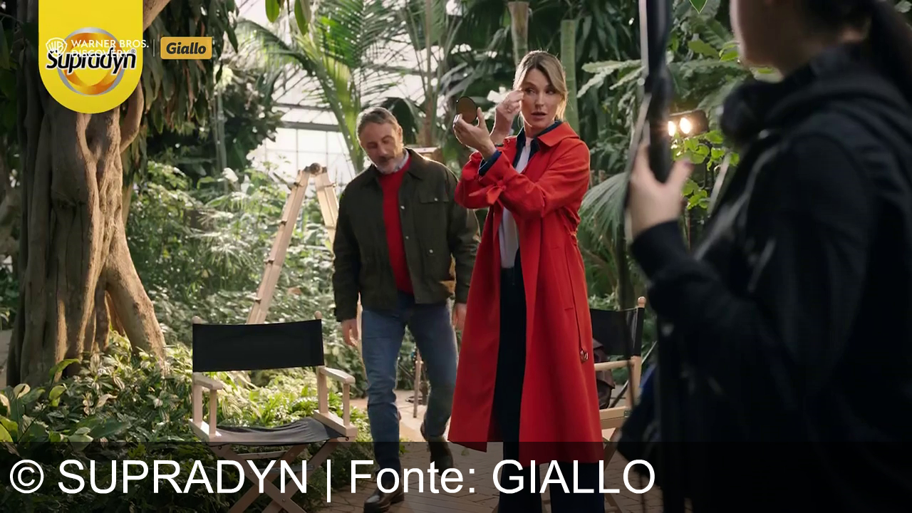 Una donna con un cappotto rosso si guarda in uno specchietto. Un uomo cammina con un giubbotto verde e jeans. Sullo sfondo, molte piante. Una sedia da regista e una persona con cuffie sulla destra. Nell'angolo in alto a sinistra, il logo giallo di Supradyn e Warner Bros.