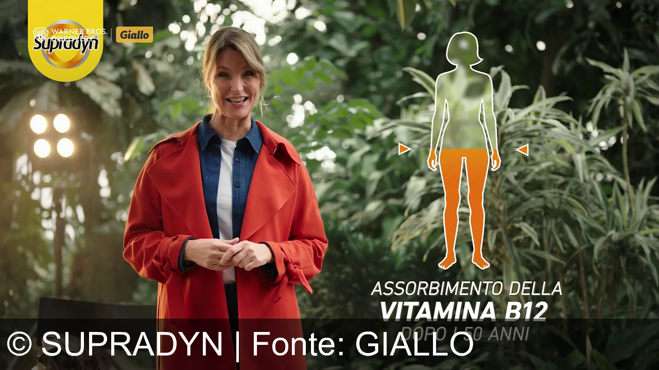 Una donna indossa un cappotto arancione e parla in uno studio con sfondo di piante. A destra c'è una confezione di integratori Supradyn Ricarica Pro B12, con dettagli su benefici per energia fisica e mentale, sistema immunitario. Sopra, testo con il nome del prodotto. Sul lato sinistro il logo Warner Bros e Supradyn Giallo.
