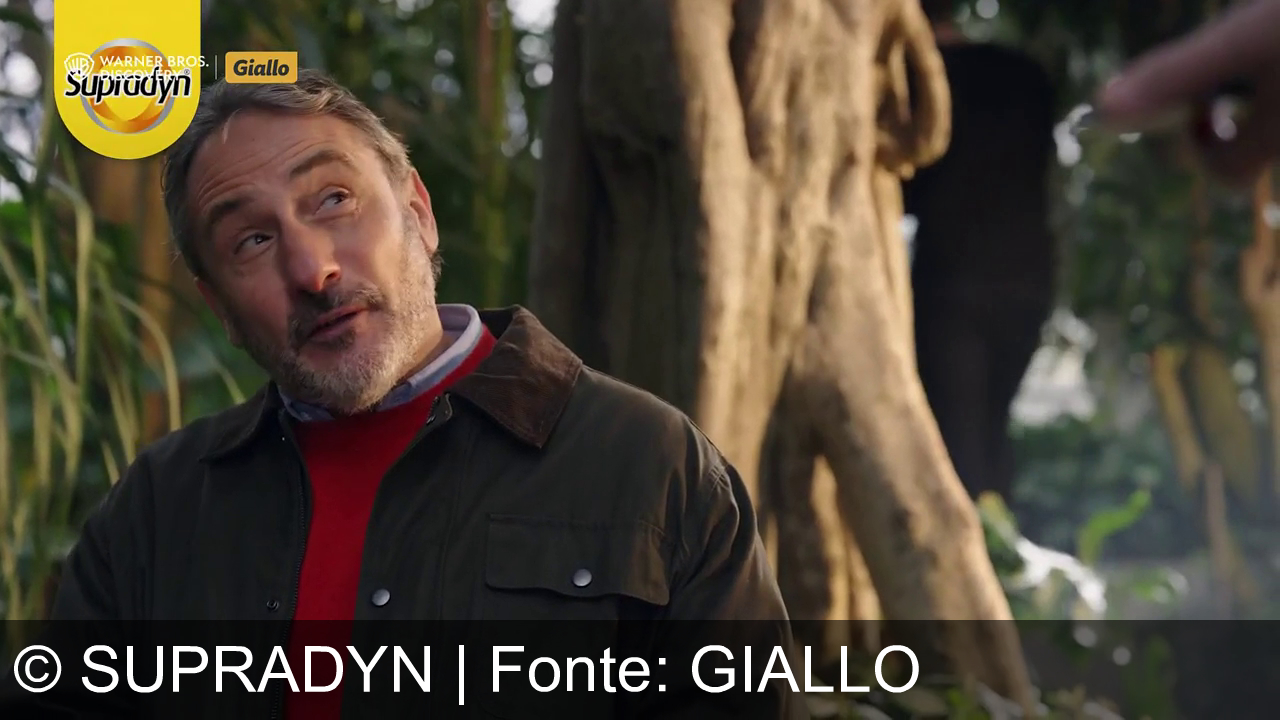 Un uomo con barba e capelli grigi indossa una giacca marrone e un maglione rosso. Sembra essere in un ambiente naturale con alberi e vegetazione. In alto a sinistra c'è il logo di Supadyn e il canale Warner Bros Giallo. Sullo sfondo, una persona di spalle in abiti neri.