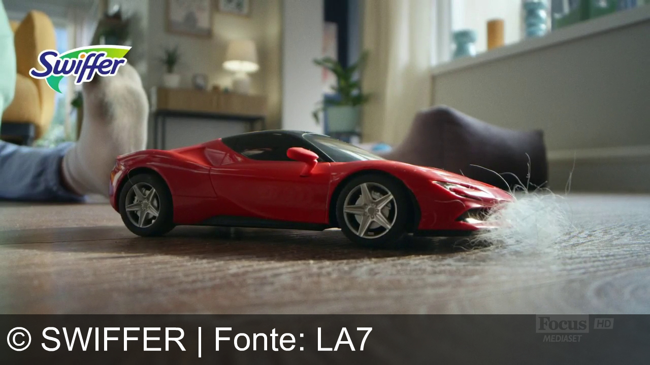 Una macchinina rossa giocattolo raccoglie polvere sul pavimento di un salotto. Un piede con calzino bianco è visibile dietro la macchina. Sulla sinistra c'è il logo Swiffer. L'ambiente è arredato con divano, tavolino e piante. Nella parte bassa si vede il logo del canale Focus HD Mediaset.