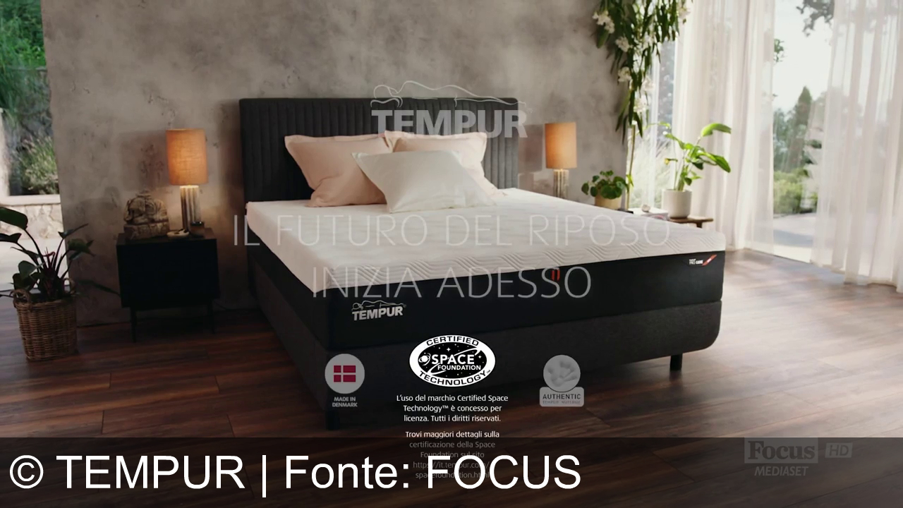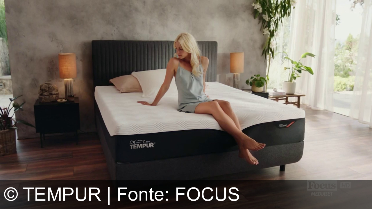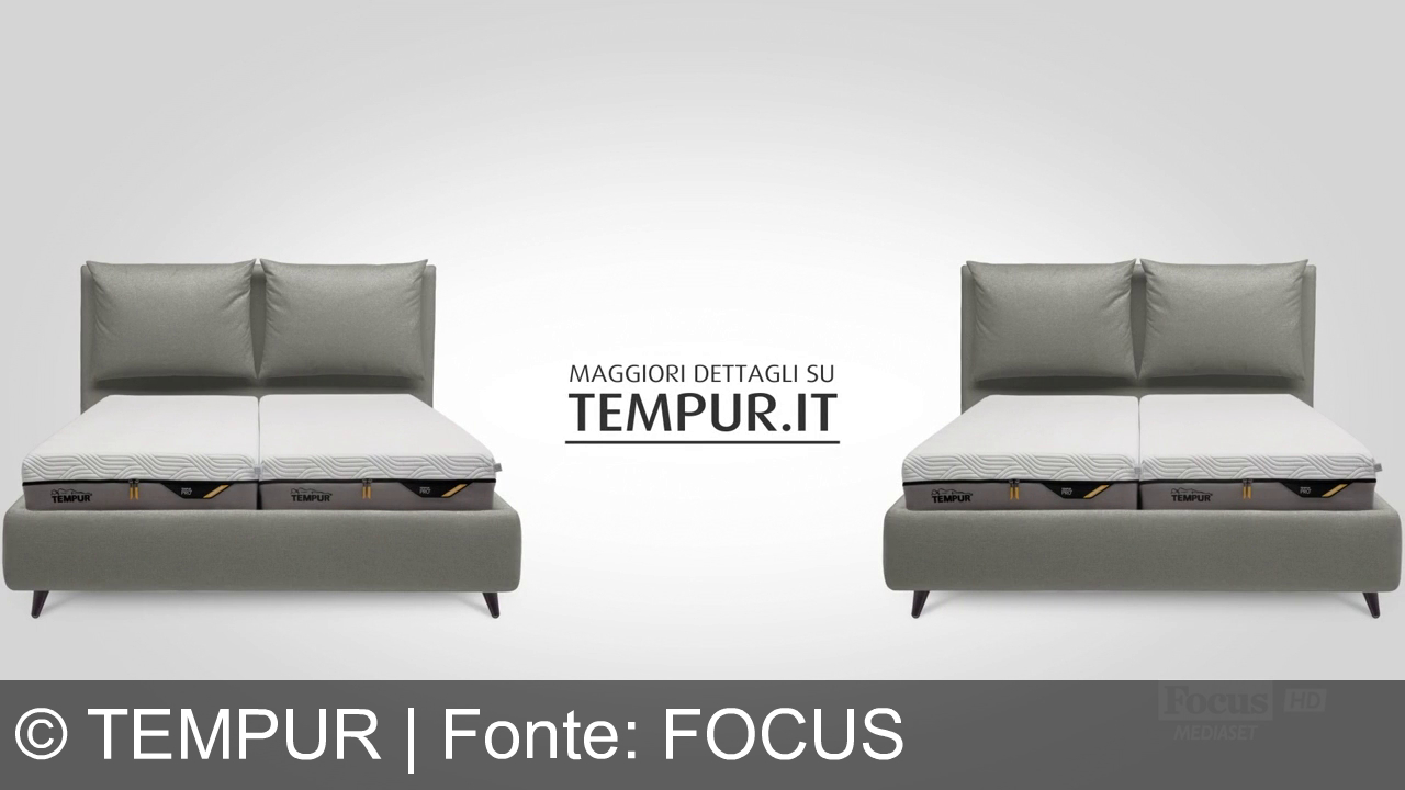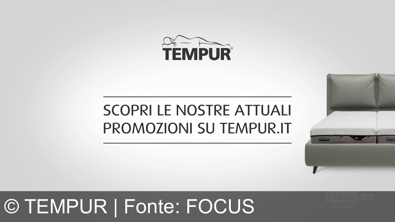 Il logo Tempur è in alto, al centro. A destra, c'è un letto con materasso Tempur. Al centro, una scritta invita a scoprire le promozioni su tempur.it. In basso a destra, c'è il logo Focus Mediaset HD. Sfondo grigio chiaro.