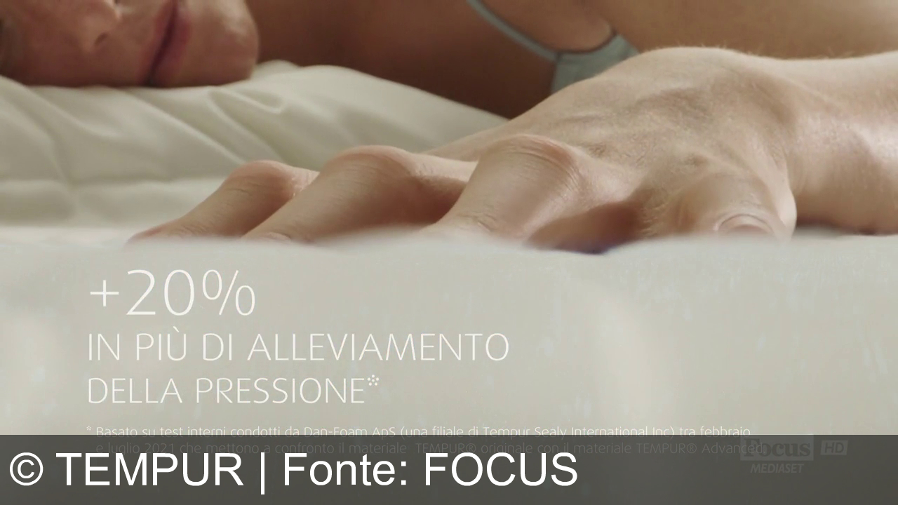 Una mano su un materasso, con un testo bianco sovrapposto che dice "+20% in più di alleviamento della pressione". Sul lato destro in basso, ci sono loghi di "Focus HD" e "Mediaset". La scritta sotto il testo principale specifica i dettagli dei test condotti su materiali TEMPUR.
