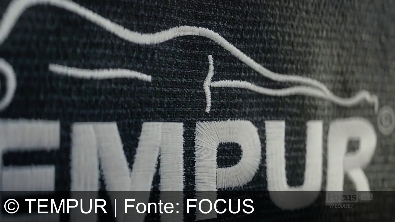 Logo bianco "TEMPUR" ricamato su sfondo scuro con silhouette stilizzata di un materasso. Scritta "Focus" e "Mediaset" con "HD" in basso a destra.