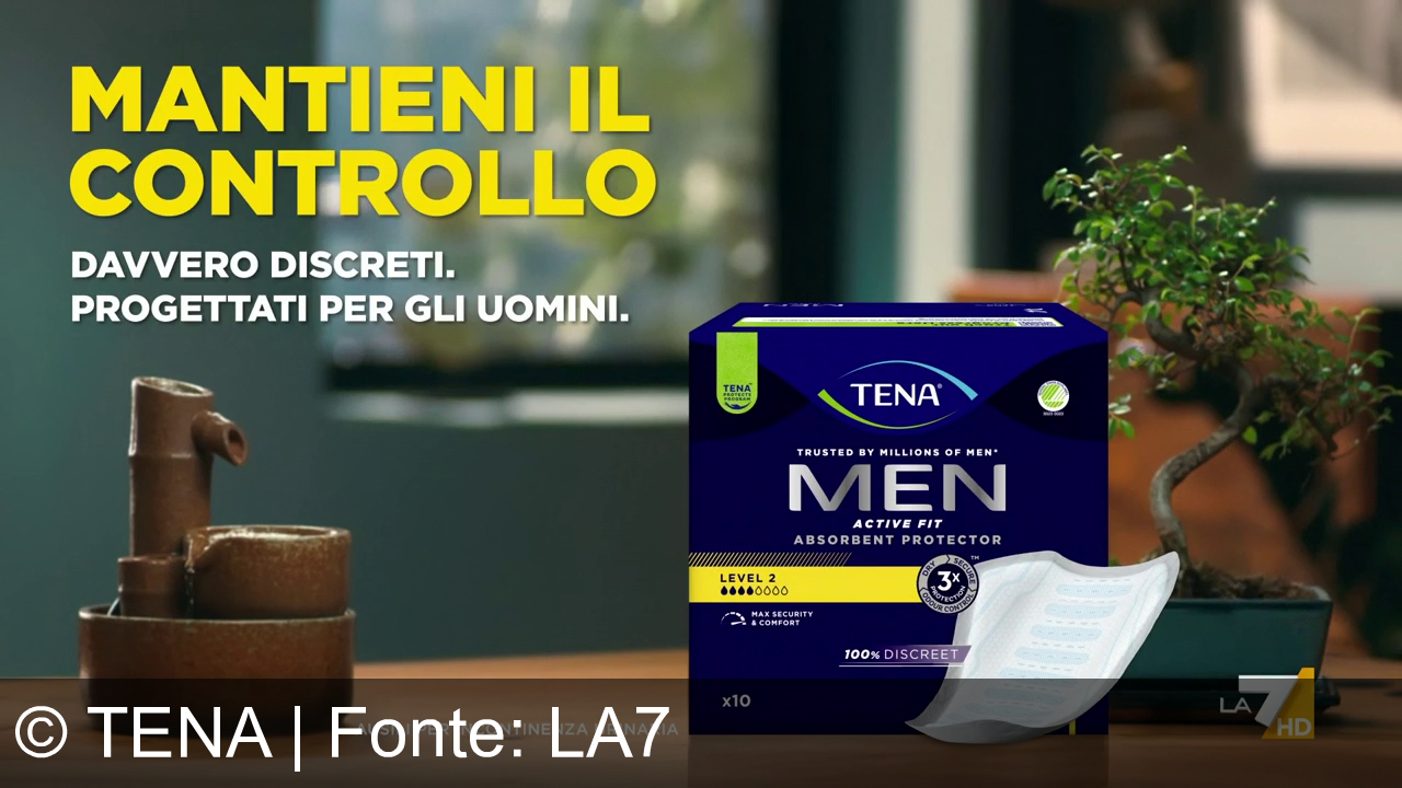 Un pacco di protezioni assorbenti TENA Men su un tavolo. Accanto, una piantina e una piccola fontana. Testo giallo in alto a sinistra: "MANTIENI IL CONTROLLO". Testo bianco sotto: "DAVVERO DISCRETI. PROGETTATI PER GLI UOMINI." In basso: "AUSILI PER INCONTINENZA URINARIA". Logo LA7 HD in basso a destra.
