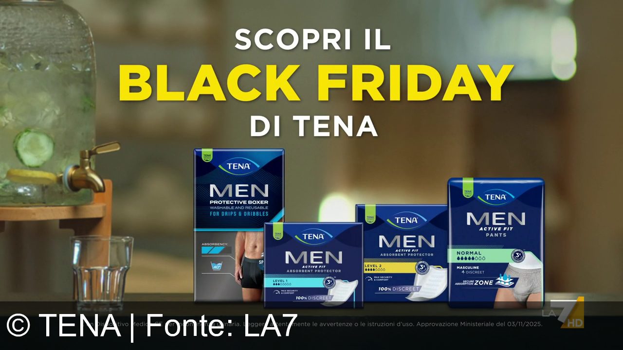 Prodotti Tena Men in primo piano su uno sfondo sfocato. Grande scritta gialla annuncia il Black Friday di Tena. A sinistra, distributore di bevande con cetrioli e bicchiere trasparente. Logo La7 HD in basso a destra. Testo in piccolo sul dispositivo medico CE.