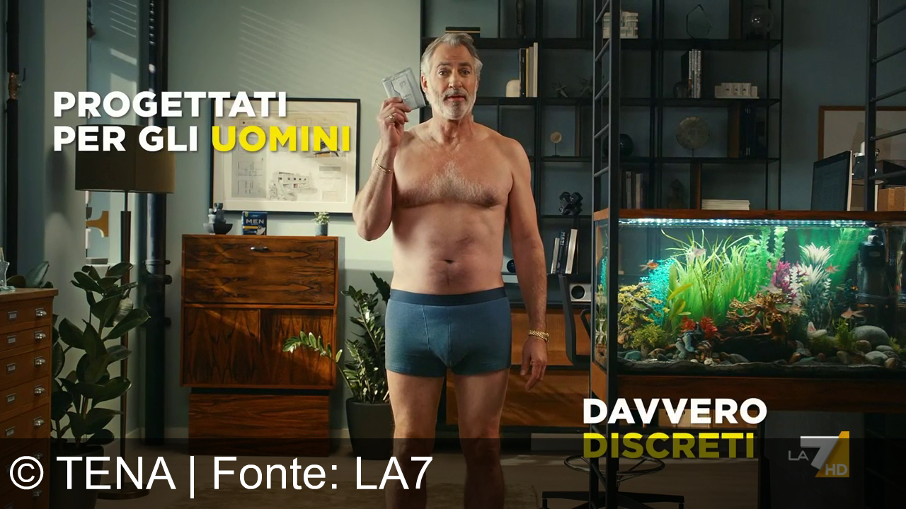 Nella sequenza successiva, l’uomo dai capelli grigi in boxer, posizionato in un contesto domestico ricco di dettagli reali – l’acquario, le piante, la libreria – mi sembra un intervento intelligente per umanizzare il messaggio. Ritengo che la scelta di insistere sulla quotidianità e la normalità possa far sentire meno soli i destinatari: il protagonista non è un attore palesemente costruito, ma un uomo qualsiasi. Credo sia una mossa che sottolinea la volontà di affrontare il disagio con naturalezza, anche grazie a quel claim: “Progettati per gli uomini. Davvero discreti”. L’uso del termine “discreti” è tutto fuorché banale in questo contesto: si rivolge a chi vive il tema con pudore, senza mai scivolare nel pietismo o nell’umorismo involontario, che spesso affligge le pubblicità di settore.