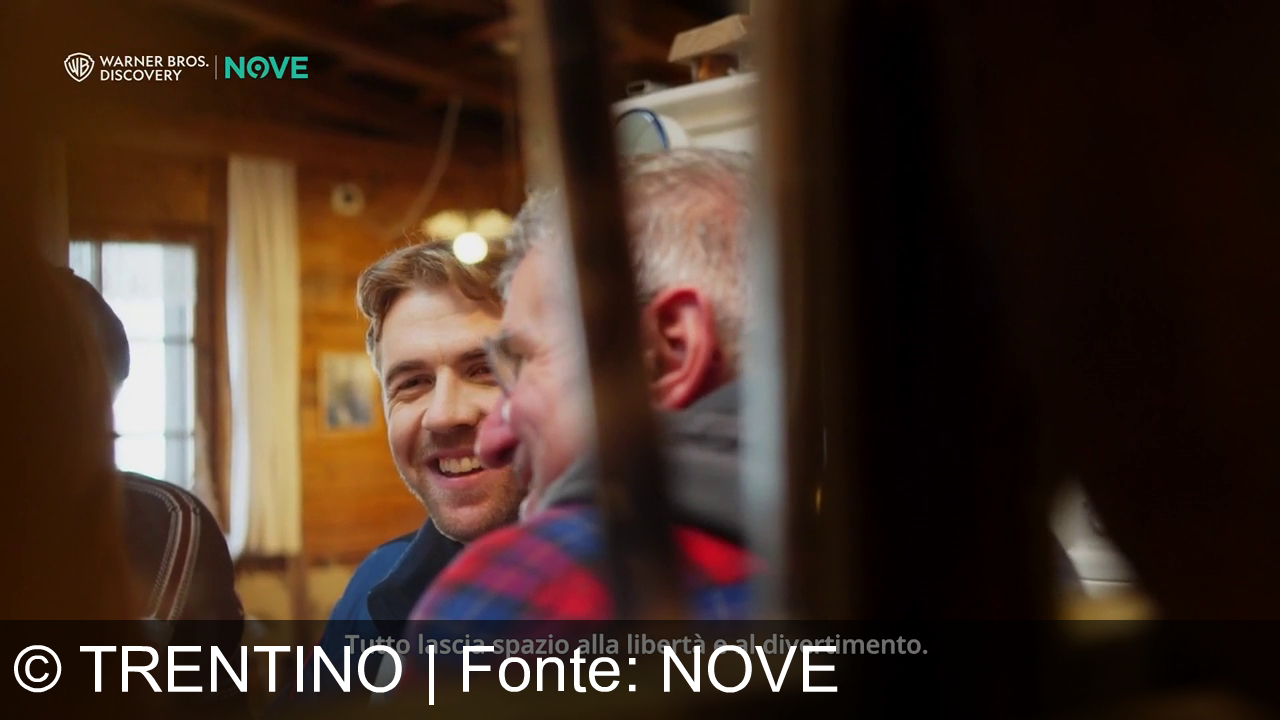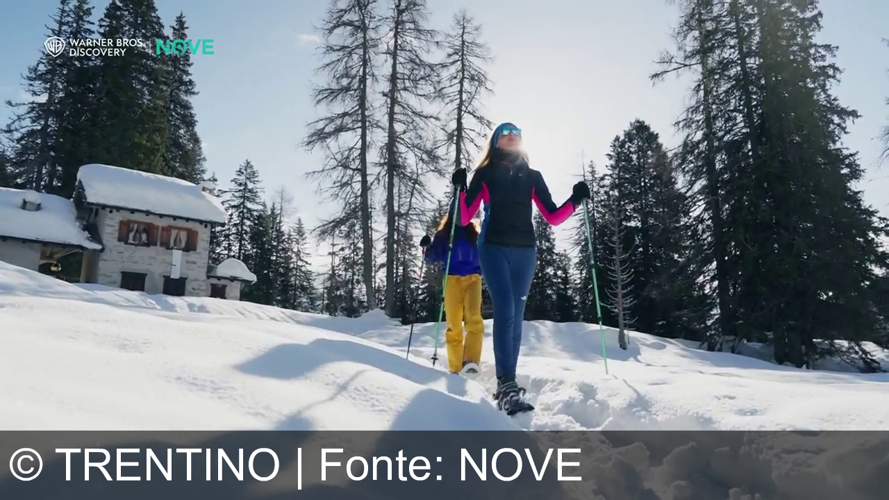 Paesaggio montuoso con cime innevate che si stagliano contro un cielo parzialmente nuvoloso. Nella parte centrale, il testo "TRENTINO PRESENTA" è visibile in grandi caratteri bianchi. In alto a sinistra, loghi di Warner Bros. Discovery e canale Nove. Ombre delle montagne si estendono in basso.