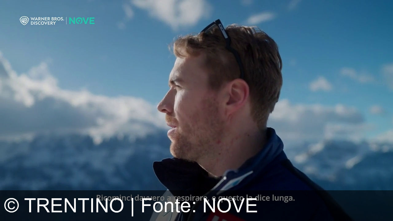Un uomo guarda l'orizzonte con gli occhiali da sole sul capo. Indossa una giacca sportiva e sullo sfondo ci sono montagne coperte di neve e un cielo azzurro con nuvole bianche. In alto a sinistra ci sono i loghi di Warner Bros. Discovery e Nove. In basso al centro, c'è il testo: "Ricomincia davvero a respirare, e questo la dice lunga."