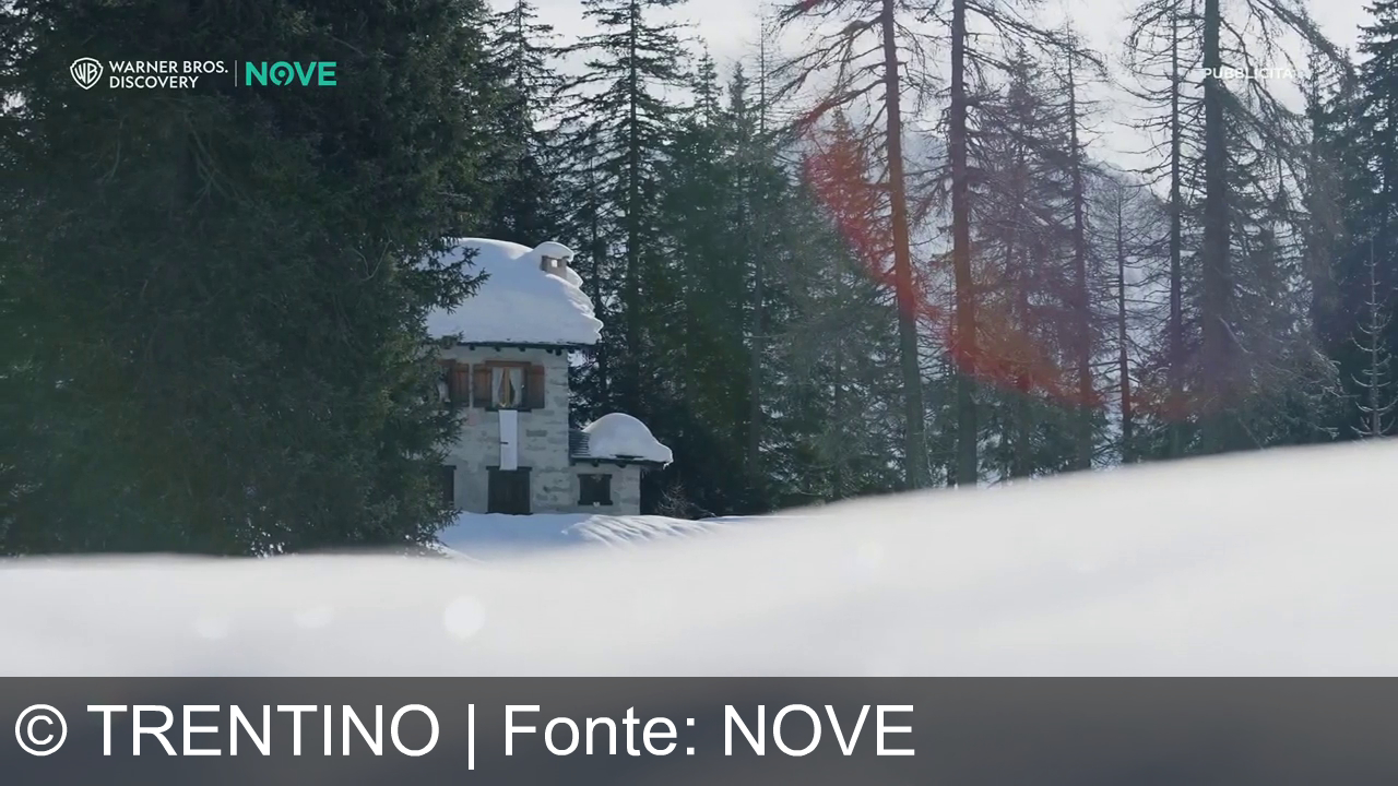 Una baita di montagna tra gli alberi, coperta di neve, con comignoli sul tetto e finestre con persiane. L'ambiente circostante è innevato e ci sono alberi alti. Marchio Warner Bros Discovery | NOVE in alto a sinistra e "PUBBLICITÀ" in alto a destra.