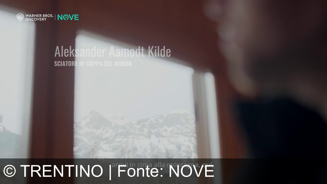 Un uomo vicino a una finestra, vista sulle montagne innevate. Testo in sovrimpressione: "Aleksander Aamodt Kilde, sciatore di Coppa del Mondo". Logo Warner Bros. Discovery in alto a sinistra. Sottotitoli in basso: "arrivi in cima alla montagna, qui".