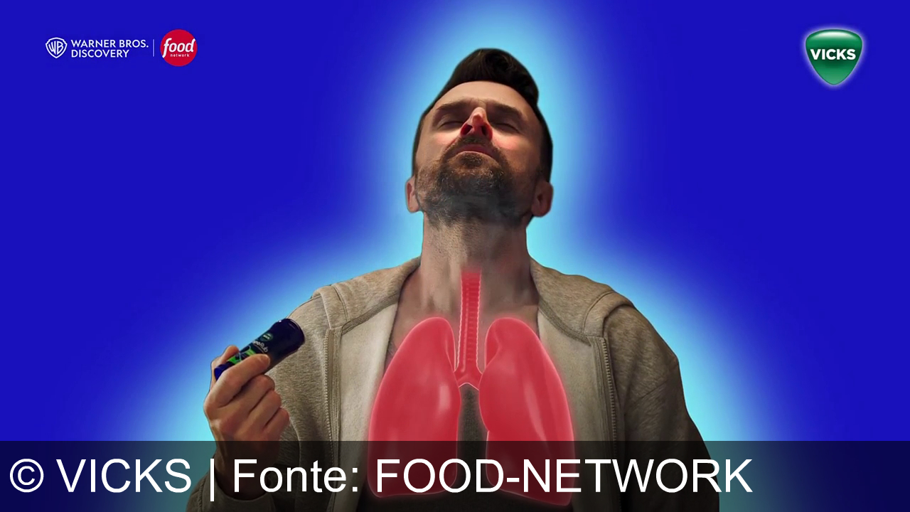 Un uomo con la testa inclinata all'indietro e gli occhi chiusi tiene in mano un barattolo blu. Indossa una felpa grigia con zip e sotto si vede l'immagine dei polmoni in rosso. Lo sfondo è blu. In alto a sinistra ci sono i loghi di Warner Bros. Discovery e Food Network. In alto a destra c'è il logo Vicks.
