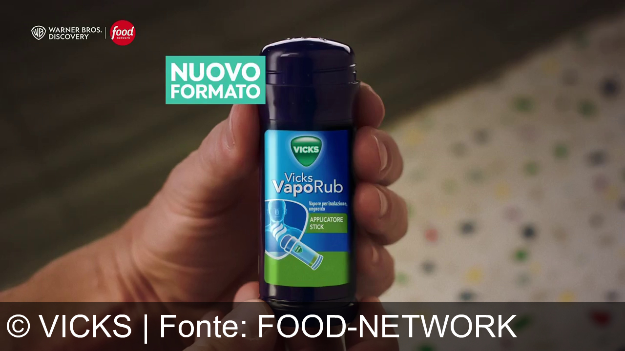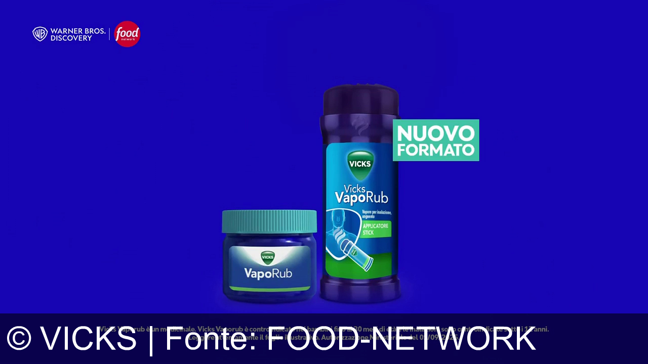 Due contenitori di Vicks VapoRub su sfondo blu. Uno è un barattolino e l'altro un applicatore stick. A destra, un riquadro verde con scritto "Nuovo Formato". In alto, i loghi di Warner Bros. Discovery e Food Network. Sotto, testo sulle controindicazioni e autorizzazione ministeriale.