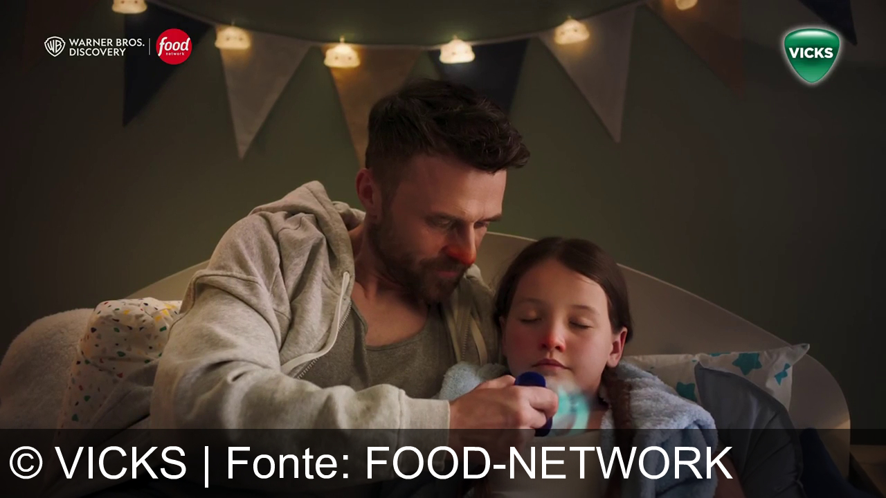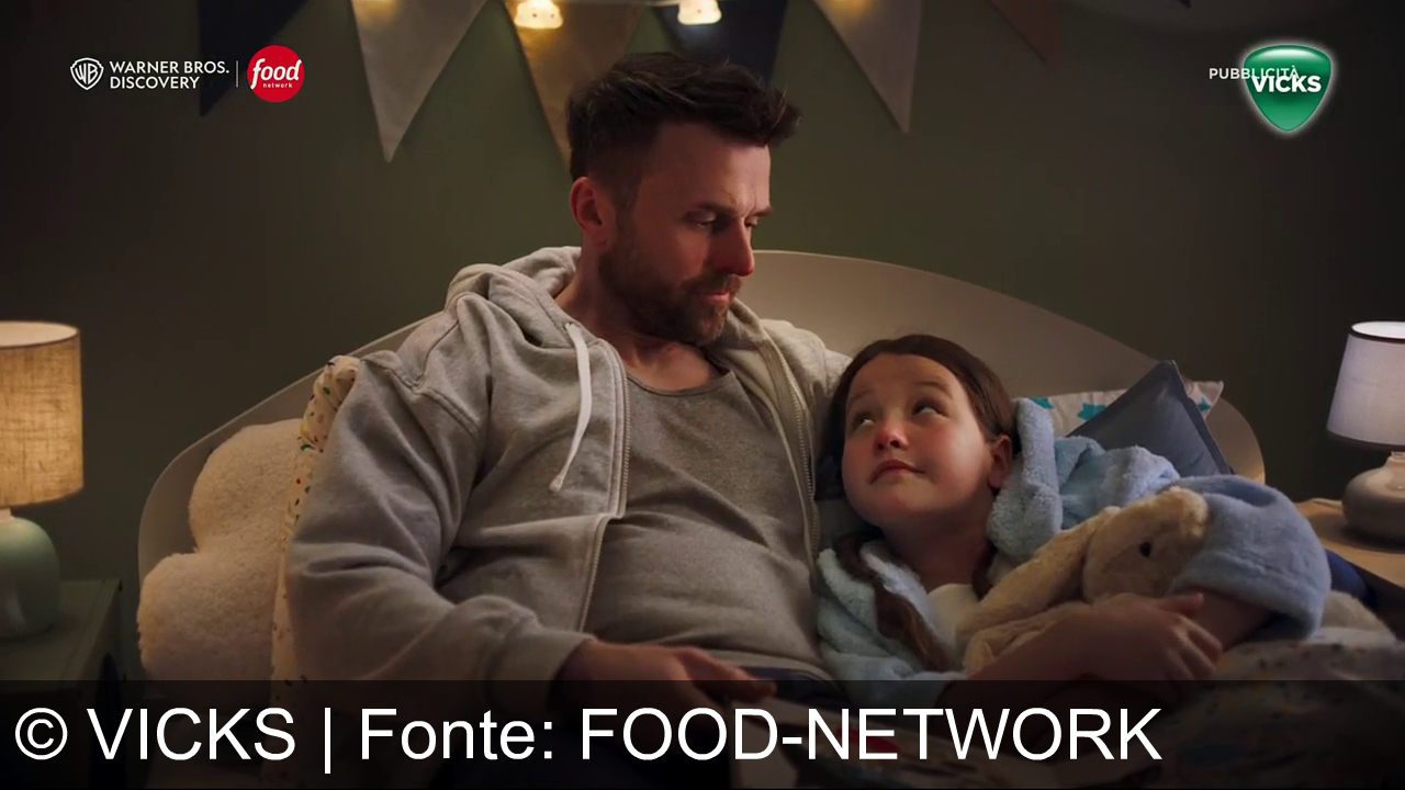 Un uomo e una bambina sono seduti su un letto. Lui indossa una felpa grigia e guarda la bambina. Lei è avvolta in un accappatoio blu e tiene in braccio un peluche. Sopra di loro ci sono delle decorazioni e sul comodino una lampada accesa. Sui lati ci sono i loghi di Warner Bros. Discovery, Food Network e Vicks.