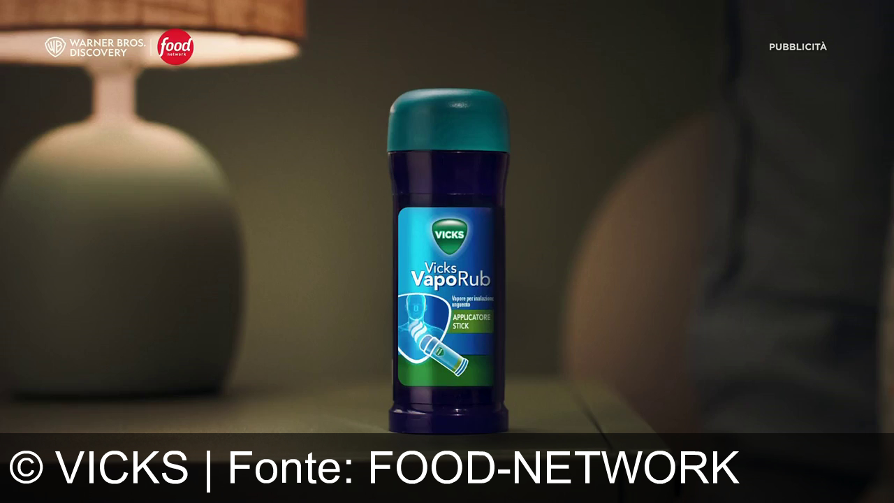 Un vasetto di Vicks VapoRub è posizionato su un tavolo. Sullo sfondo c’è una lampada accesa. Nell'angolo in alto a sinistra ci sono i loghi di Warner Bros. Discovery e Food Network, mentre in alto a destra c’è la scritta "PUBBLICITÀ".