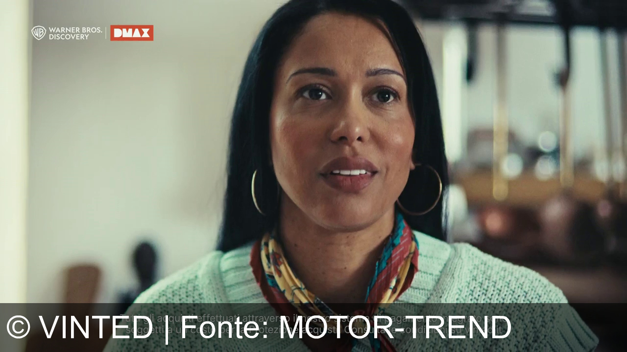 Una donna con lunghi capelli scuri e orecchini a cerchio guarda in avanti. Indossa un maglione chiaro e una sciarpa colorata. Gli angoli in alto a sinistra mostrano i loghi Warner Bros. Discovery e DMAX. In basso, c'è del testo che parla di acquisti e condizioni su un sito web. Sullo sfondo, l'ambiente è sfocato.