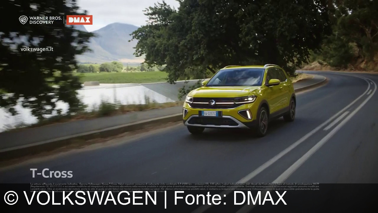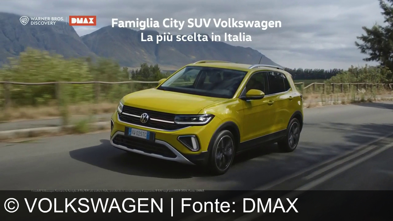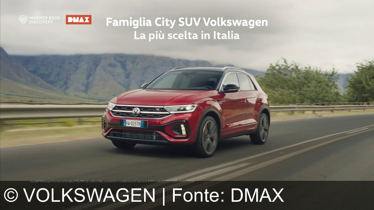 Un SUV Volkswagen rosso viaggia su una strada con montagne sullo sfondo. In alto ci sono i loghi Warner Bros. Discovery e DMAX, con il testo "Famiglia City SUV Volkswagen, La più scelta in Italia". La targa dell'auto è visibile e in basso c'è un testo piccolo.