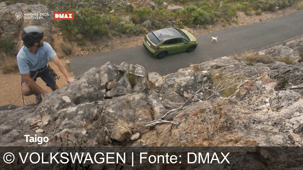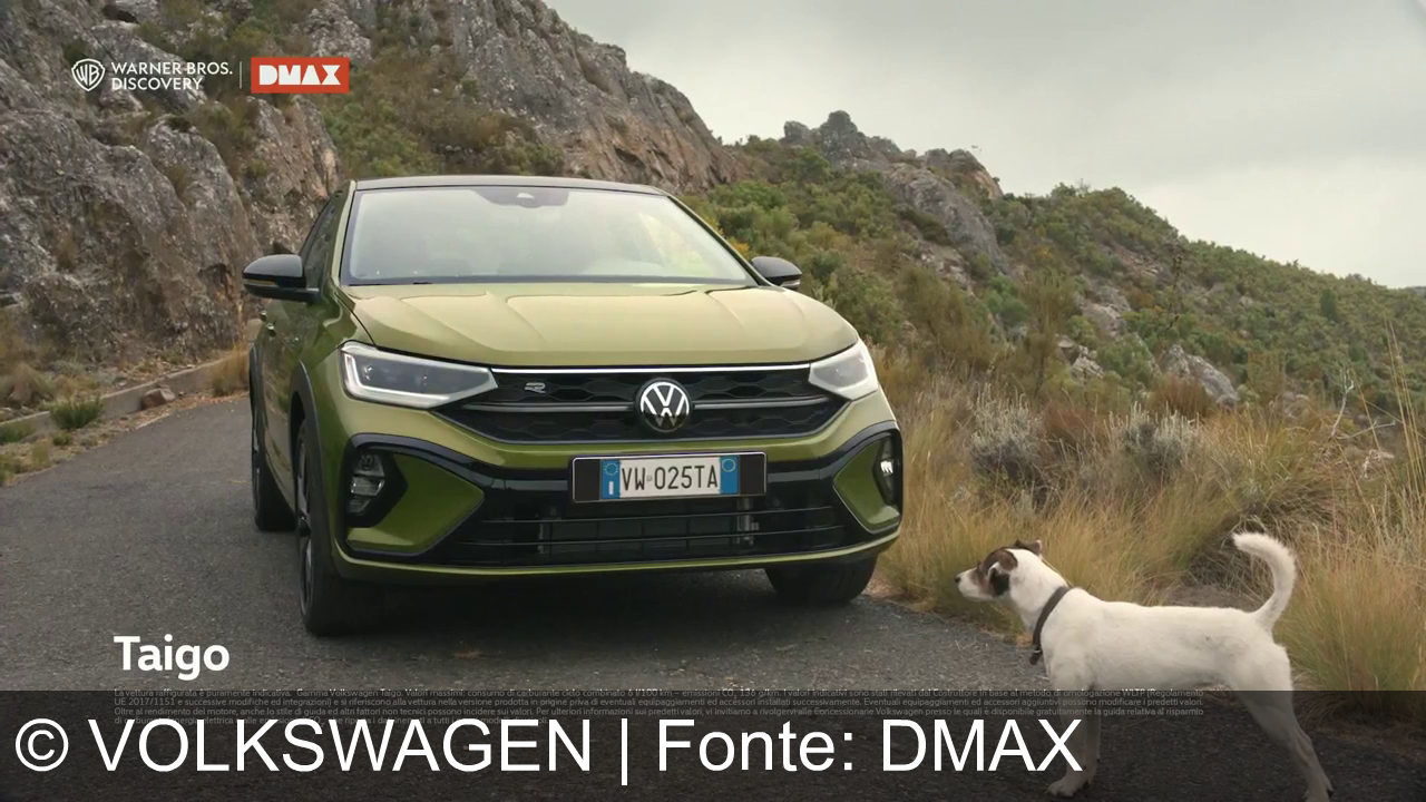 Una macchina Volkswagen Taigo di colore verde è parcheggiata su una strada di montagna. Un cane bianco a macchie nere la osserva da vicino. Sullo sfondo ci sono rocce e vegetazione. Nell'angolo in alto a sinistra sono presenti i loghi Warner Bros. Discovery e DMAX. In basso a sinistra c'è testo informativo sull'auto.